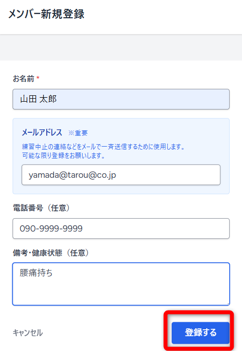 ・必要であれば電話番号や備考(「腰痛持ち」などの健康情報)を入力し、「登録する」を押します。