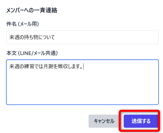 「急な連絡事項」がある場合、登録されているメンバー全員にメッセージを送れます。