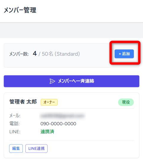 ・メンバー管理画面の右上(スマホではメンバー数表示の隣)にある「+追加」ボタンを押します。