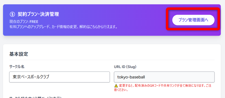 ・フリープランから、スタンダード・プロプランへ変更する手順です。団体設定画面から「契約プラン・決済管理」画面を開きます。