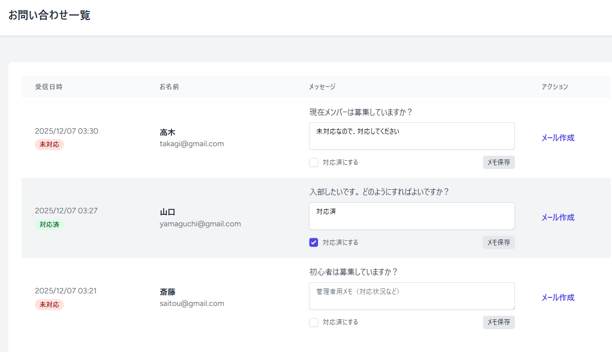 各お問い合わせには「管理者メモ」を残せます。「〇日に体験参加予定」「入会済み」などを記録しておくと、他の幹事と情報共有するのに便利です。