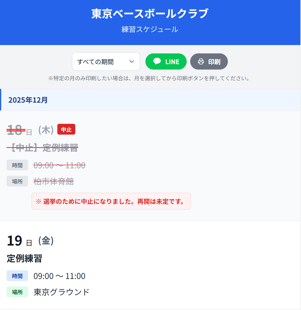 - 紙に印刷する: 「印刷」ボタンを押すと、A4用紙にきれいに収まる「印刷専用レイアウト」で出力されます。体育館への提出用や、スマホを持たないメンバーへの配布に使ってください。