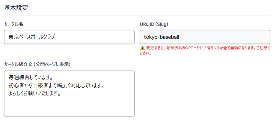 - URL ID (Slug): サークルの公開ページのURL末尾(.../club/〇〇)になる部分です。